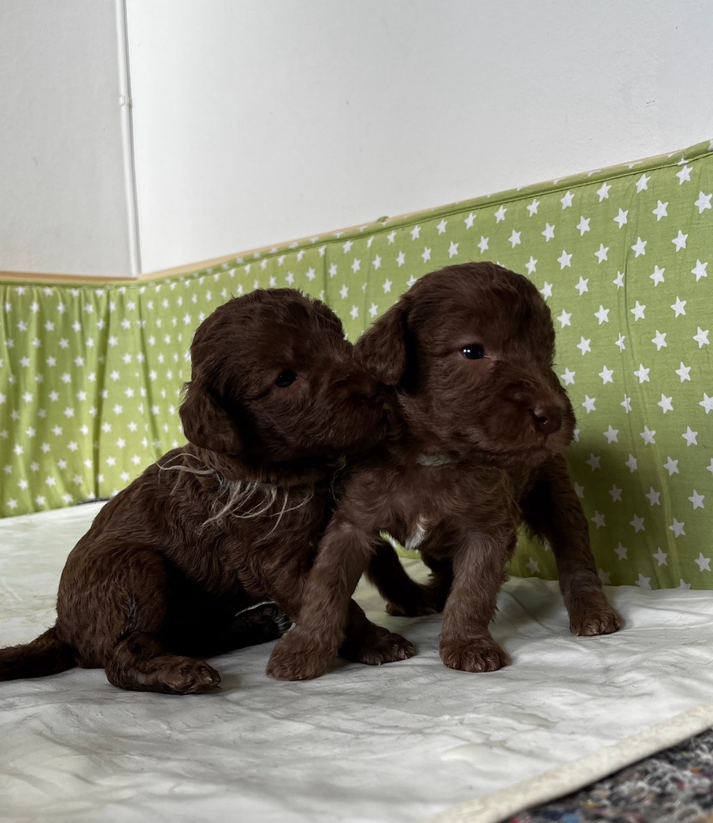 Lady och Ludde är dom som är sandfärgade. Dom ses ofta ihop. Inte bara halsbanden som visar skillnad. Ludde har större huvud eller om jag ska uttrycka att Lady har ett nättare.